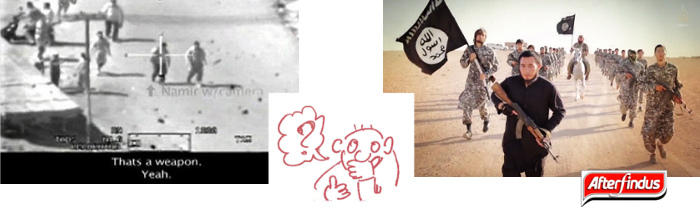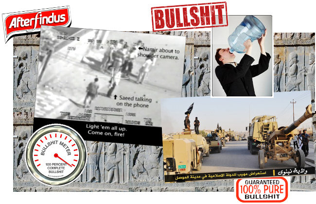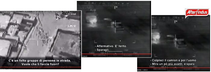Per le immagini si ringrazia: Wikipedia per i bassorilievi assiri, le solite agenzie internazionali (Reuters, Associated Press, Al Jazeera) per le foto dell’ISIS, e Wikileaks per le immagini satellitari delle strade di Baghdad. A proposito delle quali, se siete interessati, sappiate che sono tratte da un video top secret delle Forze Armate americane pubblicato da Wikileaks il 5 aprile 2010. Il video si chiama “Collateral Murders” (“Omicidi collaterali”), e mostra l’esecuzione “da remoto” di una dozzina abbondante di persone, tra cui due inviati stampa della Reuters. Lo trovate qui. I fotogrammi sottotitolati in italiano sono tratti dal documentario “Il nuovo secolo americano”, del 2007. L’omino perplesso nella penultima immagine è, naturalmente, di papà Elio.